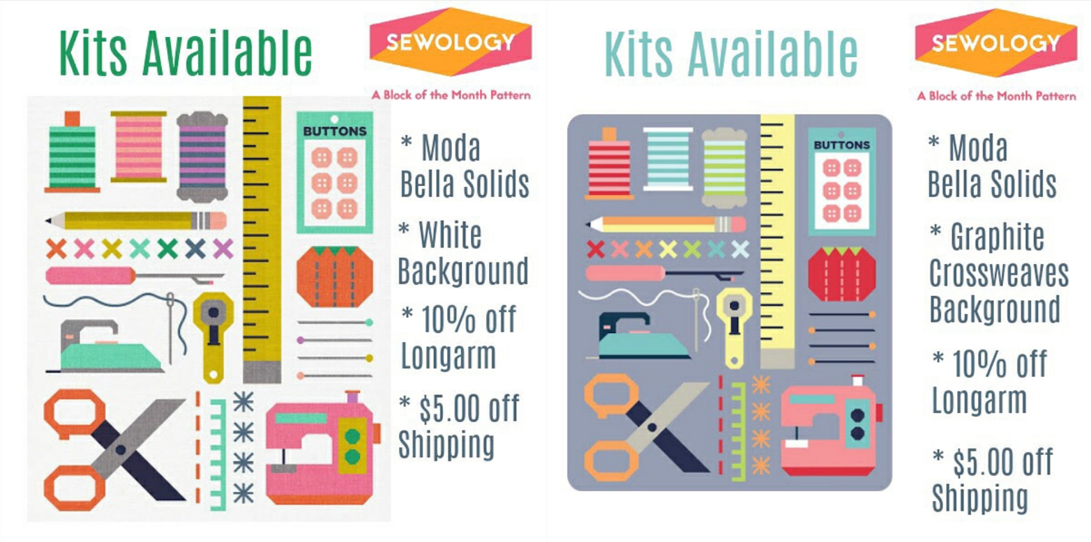 I've had some online and local quilt shops offer to make kits for some of the Sewology quilt samples in the pattern! Here is a list of where you can find them!